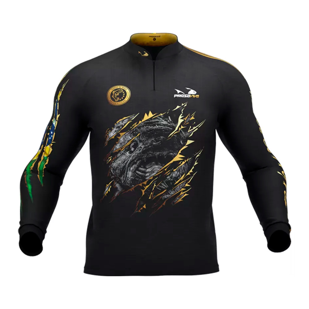 Camisa sublimada Presa Viva Tecnologia Dry, que proporciona máximo conformo térmico durante a atividade, modelo raglã manga longa, fechamento com zíper.
