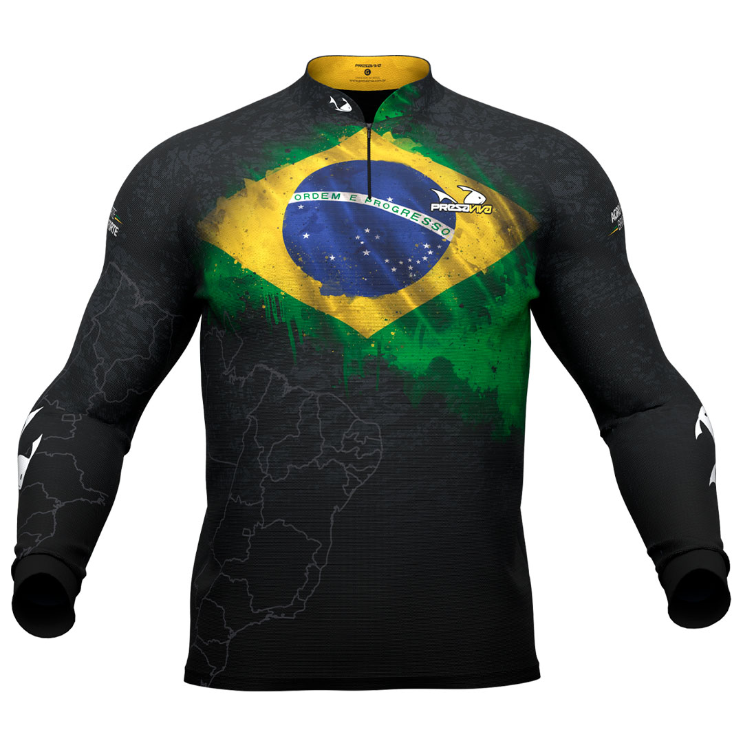 Camisa sublimada Presa Viva Tecnologia Dry, que proporciona máximo conformo térmico durante a atividade, modelo raglã manga longa, fechamento com zíper.