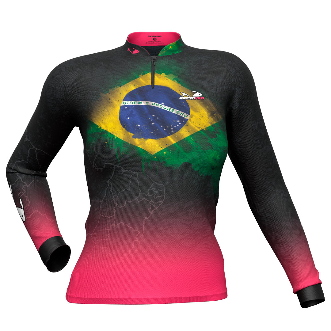 Camisa sublimada Presa Viva Tecnologia Dry, que proporciona máximo conformo térmico durante a atividade, modelo raglã manga longa, fechamento com zíper.