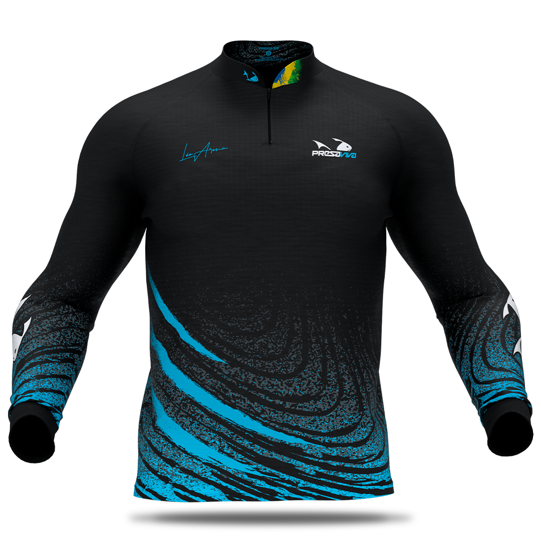 Camisa sublimada Presa Viva Tecnologia Dry, que proporciona máximo conformo térmico durante a atividade, modelo raglã manga longa, fechamento com zíper.