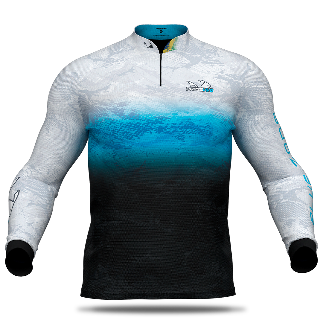 Camisa sublimada Presa Viva Tecnologia Dry, que proporciona máximo conformo térmico durante a atividade, modelo raglã manga longa, fechamento com zíper.