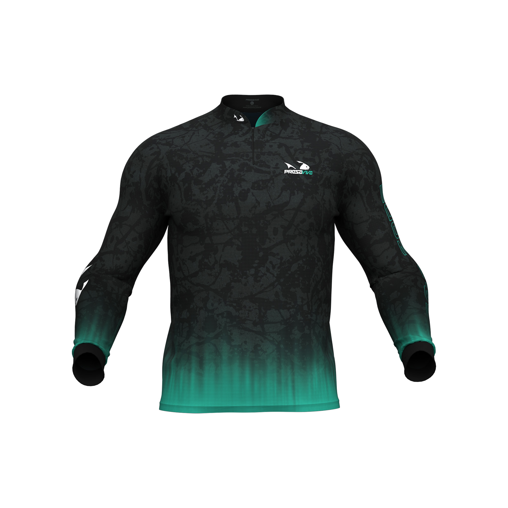 Camisa sublimada Presa Viva Tecnologia Dry, que proporciona máximo conformo térmico durante a atividade, modelo raglã manga longa, fechamento com zíper.